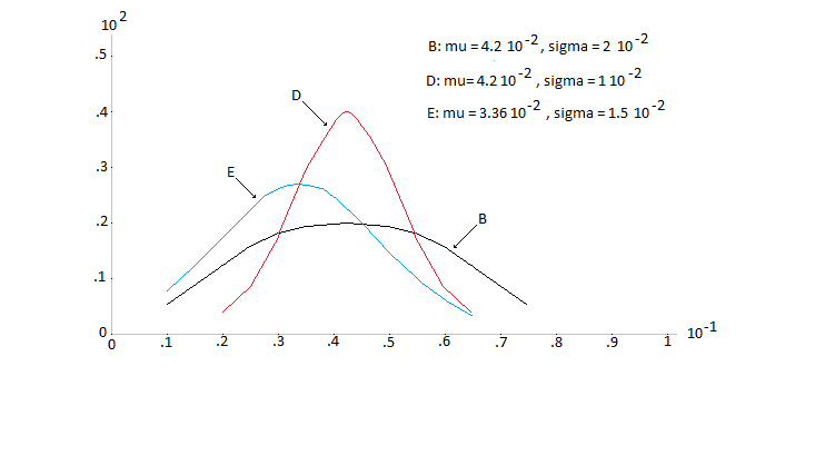 View attachment 2931One thing immediately clear is that the average of the curve B and curve D is exactly the same: $\displaystyle \mu = 4.2\ 10^{-2}$. Different are the standard deviations: $\displaystyle \sigma= 2\ 10^{-2}$ for the curve B and $\displaystyle \sigma = 10^{-2}$ for the curve D. This instinctively suggests two possible hypotheses: 1) the bordereau is a work of Dreyfus 'uncertain' as psychologically affected by what he was doing [in practice it coincides with that hypothesis made by Bertlillon ...], 2) the