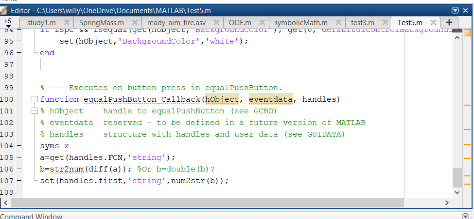 Happy Sunday, I am trying to create a MATLAB GUI that can take an input ( i am starting out with just one variable) and take its derivative and display the result. I have attached pictures of what my GUI looks like, and also the code I wrote so far.