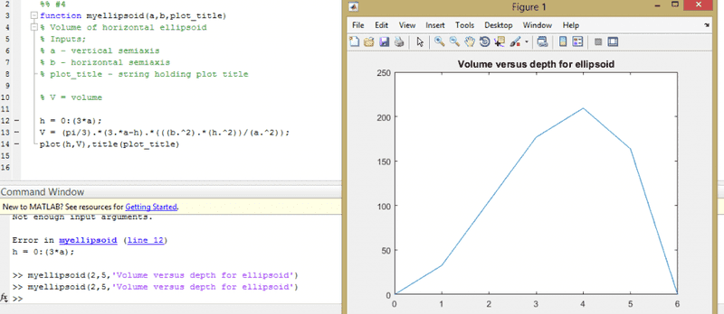 The discussion revolves around a problem related to developing a MATLAB function for calculating the volume of liquid in a partially filled ellipsoid-shaped tank. Participants are attempting to create a plot of volume versus depth and are encountering issues with function inputs and definitions.