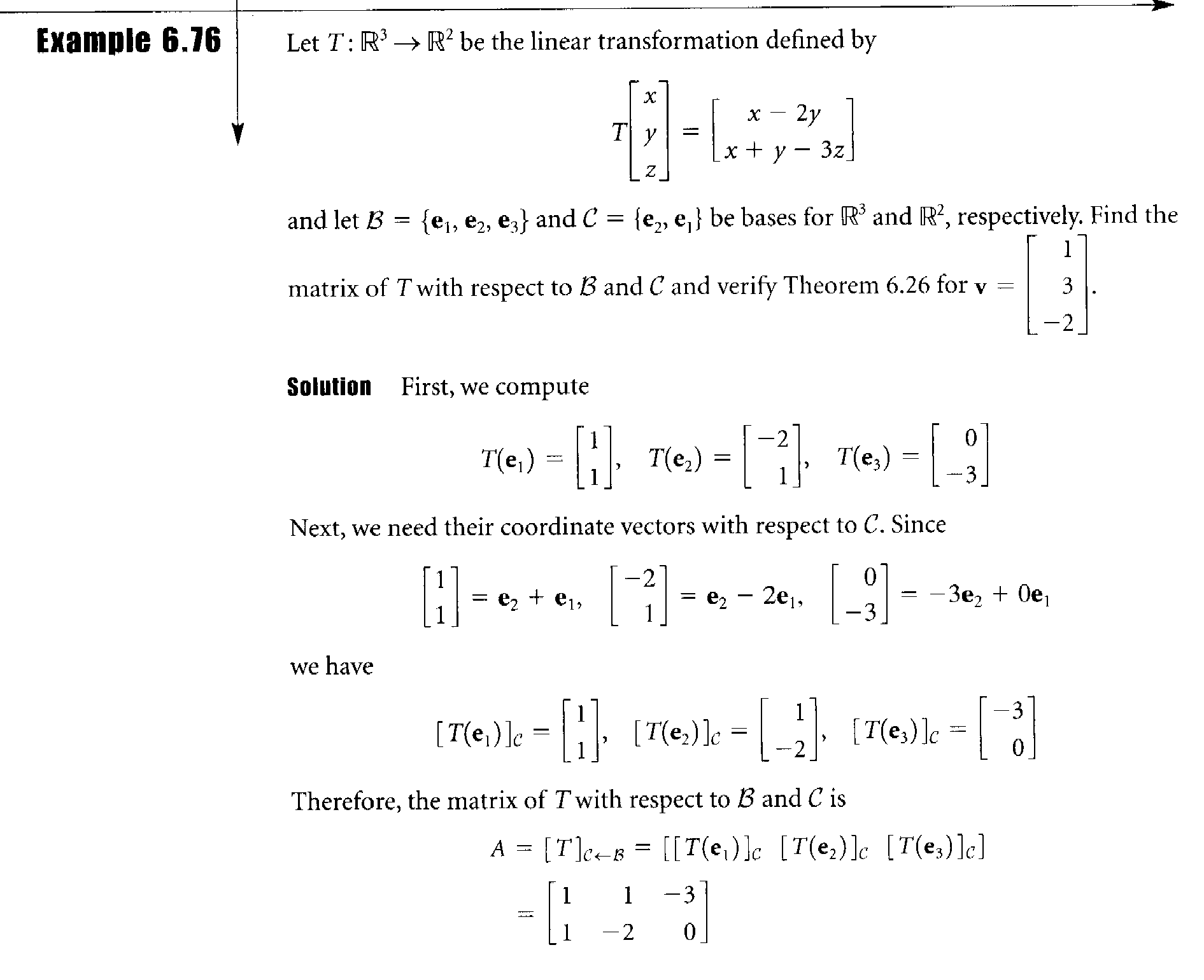 ... BUT ...Poole states that the bases are $$\mathcal{B} = \{ e_1, e_2 , e_3 \}$$ and $$\mathcal{C} = \{ e_2, e_1 \}$$... ?So, in the example, it seems that $$T$$ is defined in terms of $$\{ e_1, e_2 , e_3 \}$$ and $$\{ e_1, e_2 \}$$ ... and then we recalculate to find the matrix of $$T$$ with respect to $$\mathcal{B}$$ and $$\mathcal{C}$$ ... ...Can someone explain what is going on here ... shouldn't $$T$$ be defined in terms of the declared bases $$\mathcal{B}$$ and $$\mathcal{C}$$ ... so that $$T$$ takes an input in terms of $$\mathcal{B}$$, and then give an output in terms of $$\mathcal{C}$$ ... ...Hope someone can clarify the above issue ...