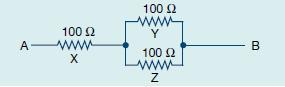 Three 100ohm resistors are connected as shown. The maximum power that can safely be dissipated in anyone resistor is 25W