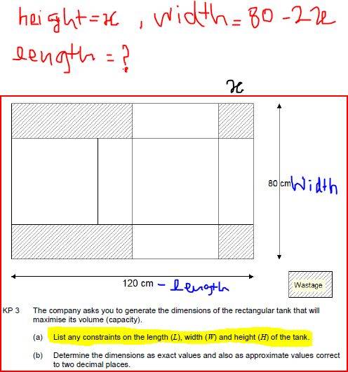 So, I have this question, but I have no idea what constraint is and how to find a constraint for the length, height and width... and if i say the square wastage is x, then the width is 80-x but I don't know what the length would be with respect to x... , and how do we determine the dimensions..?