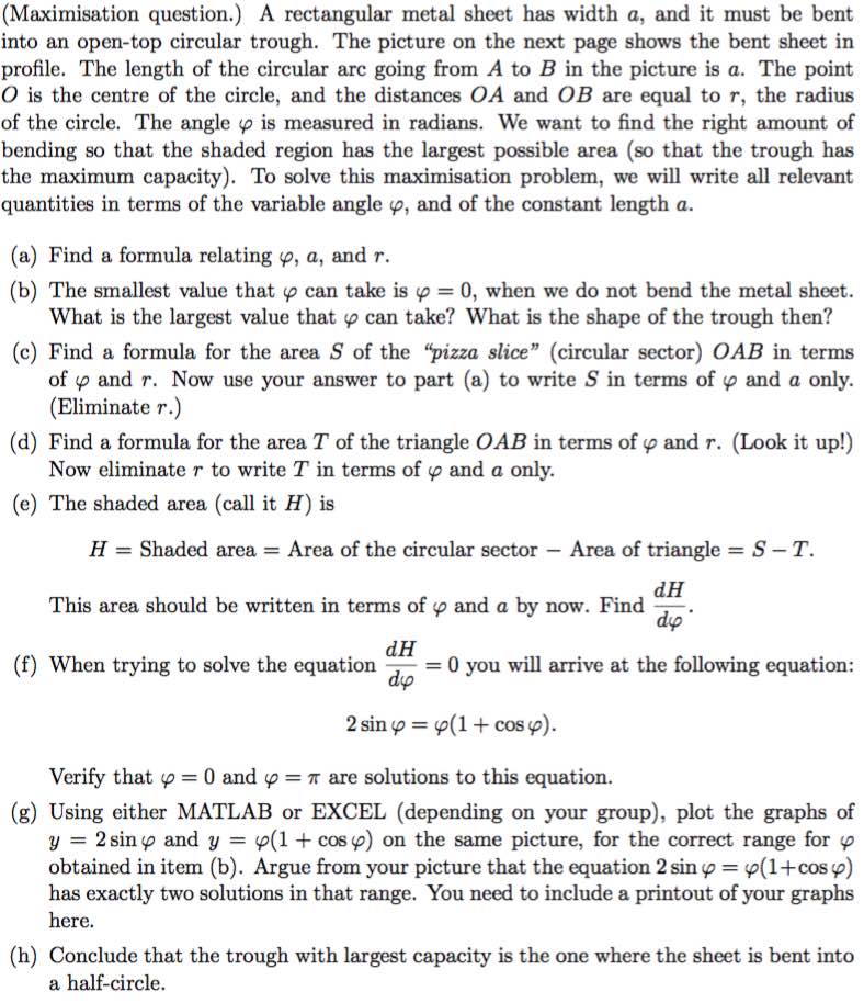 For Part h: I am unsure of how to find the largest capacity where the sheet is bent into a half-circle. My intuition says it is where $\varphi$ is equal to $\pi$ $radians$ as $2\pi$ $radians$ is equal to a full revolution of a circle.