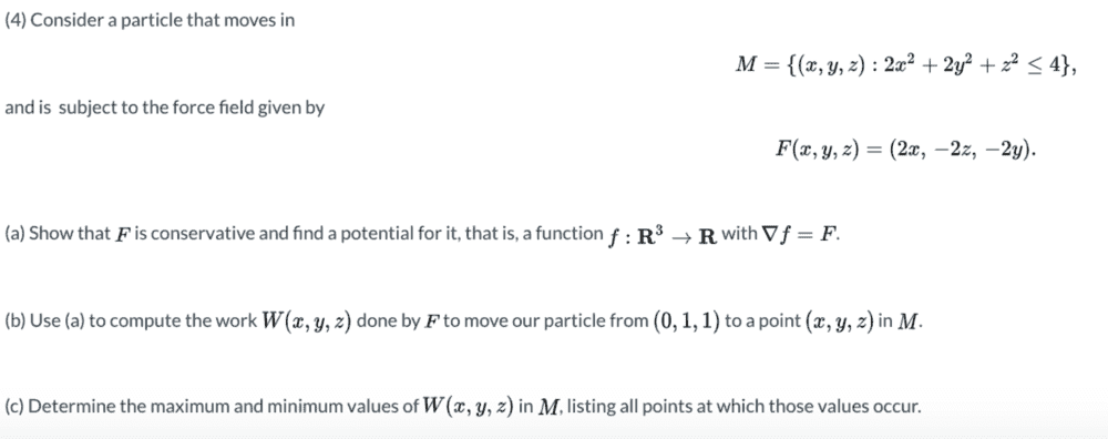 The beginning is straight forward and I found f=x^2-2yz, which satisfies grad(f)=F. Then I calculated W= f(x,y,z)-f(0,1,1) since it's conservative.