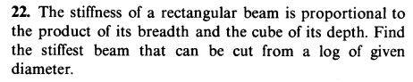 The discussion revolves around a maximization problem related to determining the stiffest beam that can be cut from a log, involving geometric and algebraic considerations. The subject area includes calculus and optimization techniques, particularly focusing on the relationships between the dimensions of the beam and its strength.