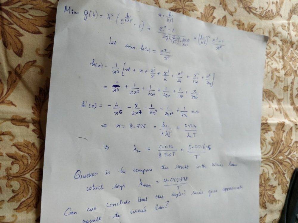 where [itex]h[/itex] is Planck's constant, [itex]c[/itex] is the speed of light, and [itex]k[/itex] is Boltzmann's constant. To find the wavelength of peak emissions, maximize [itex]f(\lambda)[/itex] by minimizing [itex]g(\lambda) = λ^{5}(e^{hc/λkT} - 1)[/itex]. Use a Taylor polynomial for [itex]e^{x}[/itex] with n = 7 to expand the expression in parentheses and find the critical number of the resulting function. (Hint: Use [itex]\frac{hc}{k}[/itex] = 0.014.) Compare this to Wien's law: