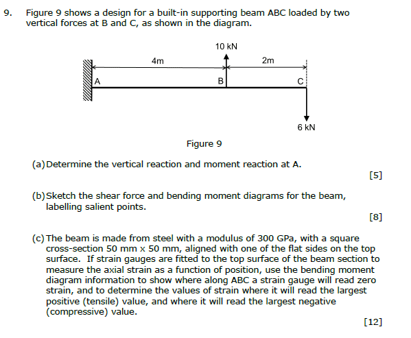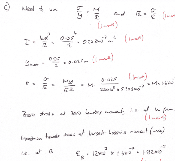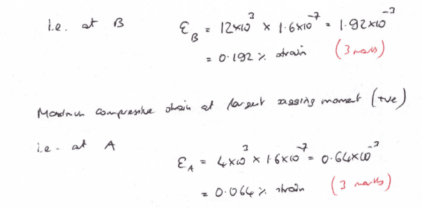 The discussion revolves around understanding the maximum tensile and compressive strain in a beam as determined by bending moment diagrams. Participants explore the relationship between bending moments, strain distribution, and the effects of sagging and hogging moments on stress and strain in beams. The conversation includes technical aspects of beam bending, sign conventions, and the placement of strain gauges.