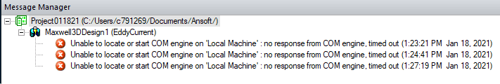 The forum discussion centers around an error encountered in ANSYS Maxwell3D, specifically the "Unable to locate COM Engine on 'Local Machine'" message. Users report this issue while attempting to solve induction problems using ANSYS Suite 2020 R1. The error appears to be a recurring problem that lacks a clear solution, as multiple users express their frustration and seek assistance without finding definitive answers.