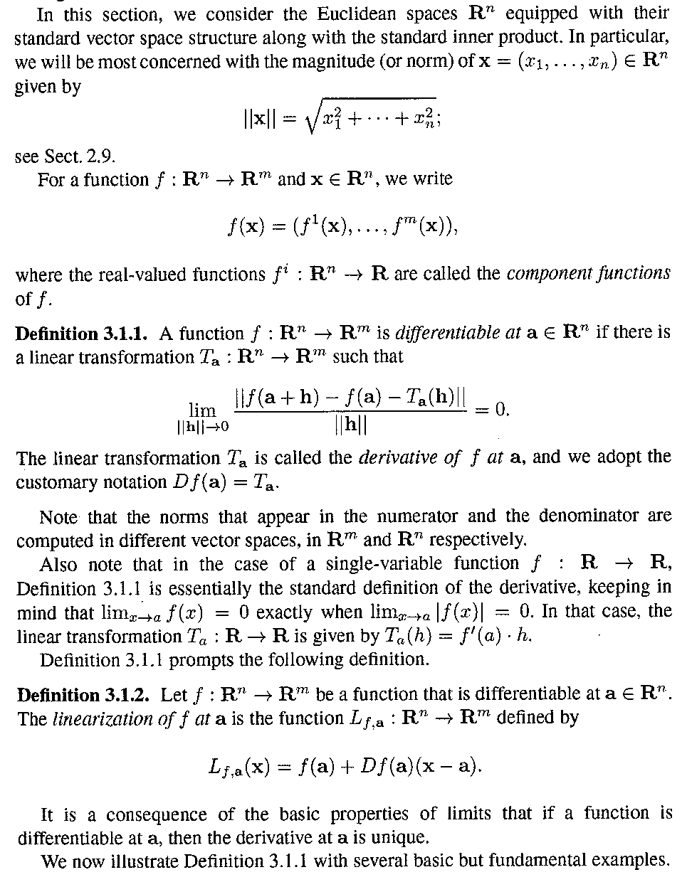 In Section 3.1 McInerney defines what is meant by a function $$f: \mathbb{R}^n \to \mathbb{R}^m$$ being differentiable and also defines the derivative of $$f$$ at a point $$a \in \mathbb{R}^n$$ ...