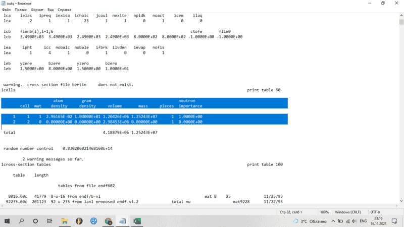 The discussion focuses on a program developed to calculate the critical mass of uranium dioxide (UO2) with a 10% enrichment, yielding a keff value of approximately 1. The user inquires about automating the input of density and volume, which are critical parameters that vary between 10.4 and 10.9 g/cm³. A workaround is suggested, utilizing the invariant relationship between density and radius, allowing for the calculation of radius based on a fixed product of density and radius without rerunning the program. Key MCNP code snippets are provided for reference.