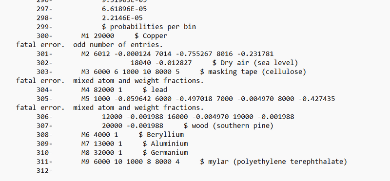 I'm trying to resolve two separate fatal errors in my MCNP deck. One is claiming that I'm mixing atom and weight fractions within a single material card, which I'm clearly not if you take a peek at the material definitions. The other is saying that I have an odd number of entries, indicating there is a discrepancy between the source energy distribution and source probabilities. I triple counted and this is also not the case. Any help would be appreciated. I have attached a screenshot of the errors.