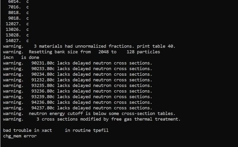 The discussion revolves around an error encountered in MCNPX version 2.7, specifically the "bad problem in xact in routine tpefil chg_mem error." Participants explore potential causes related to memory allocation, library files, and installation paths, focusing on troubleshooting the issue within a Windows operating system context.