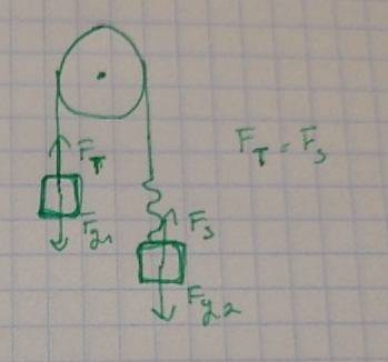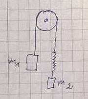 m1= 0,05 kg, m2= 0,03 kg, mass of spring is omitted. We look at movement after spring stopped vibrate. How long does the spring measure during the movement if not stretched spring measure 0,1 meter and if we use force 0,1N elongation measures 0,02 meter.