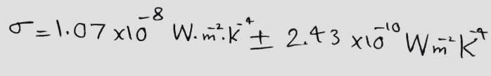My try: $$ \sigma = 1.07 \times 10^{-8}W.m^{-2}.k^{-4} \pm 0.0243 \times 10^{-8} W.m^{-2}.k^{-4} $$