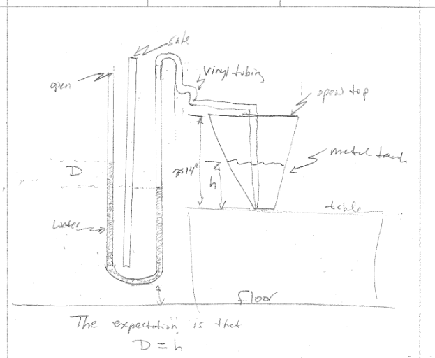 I have a homemade U-tube manometer that is open on one end, and the other has tubing attached to a rigid tube that is in the tank to the bottom. As we add water to the tank, the fluid in the manometer is displaced as expected. We read the fluid displacement in one tube on a scale on the manometer and then doubled it to get the total displacement (the fluid in the other tube goes down due to the pressure exerted by the water in the tank.) However, the displacement does not equal the water level in the tank. The displacement is approximately 1/2 of the water level in the tank. It appears to be consistent for various depths of water in the tank.
