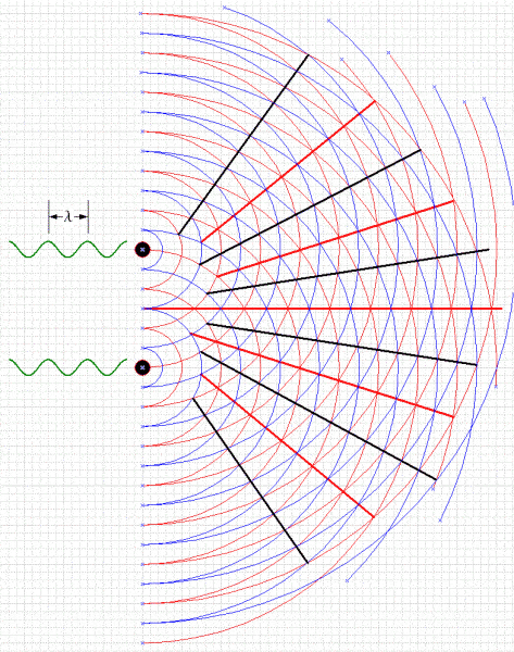 The discussion revolves around measuring wavelength in a double-slit interference pattern, specifically addressing discrepancies between measurements and textbook answers. The user measures the wavelength as 0.5 cm by measuring from the middle of one white line to the next, while the textbook states the wavelength is 1 cm. Participants clarify that the correct method involves measuring from peak to peak or trough to trough, and emphasize the importance of measuring radially from the source to account for geometrical projection effects. The conversation highlights the variability in wavelength measurements along different nodal and antinodal lines, suggesting that consistent methodology is crucial for accurate results.