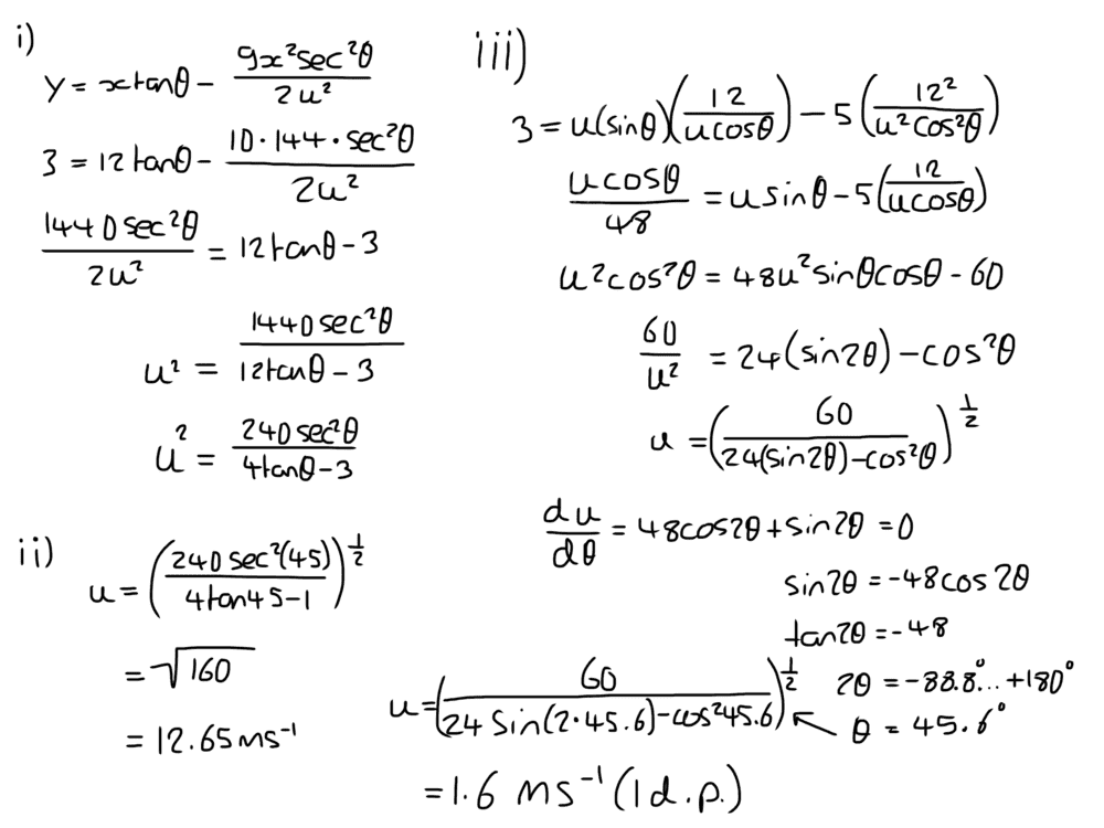 I think I have the correct answers for the first two. I followed the method in this link https://www.youtube.com/watch?v=cZiA4U4QRZg for the last, using differentiation to find the min velocity, but the angle comes out very close to 45° like (ii), but the velocity is much lower. Think it may be because the question in the link has ball starting on the ground, whereas in the question above it is 3m above the ground. I inputted y = 5-2 = 3 into the Cartesian equation, maybe this is wrong? Or I have rearranged and differentiated the equation wrong.