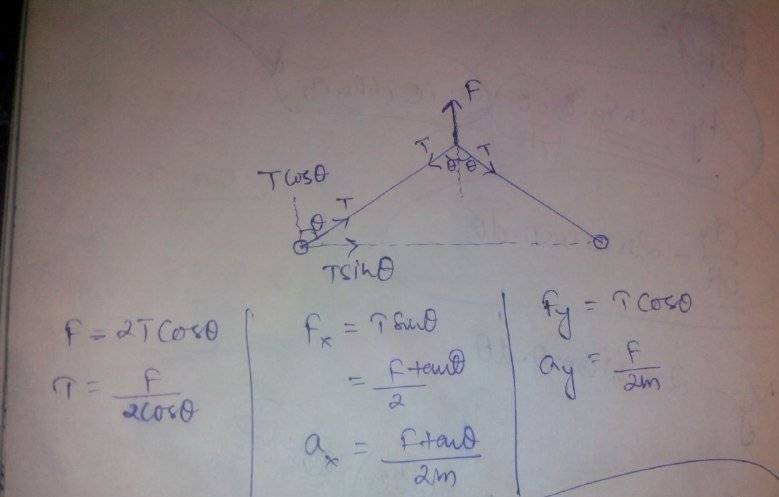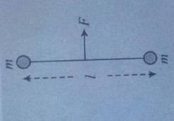 There are two masses (m) tied at two ends of a string of length 'l'. Whole system is placed on a friction-less surface and force 'F' is applied at the centre of string in direction perpendicular to the string. Find the time taken by masses to come together and nature of path followed.