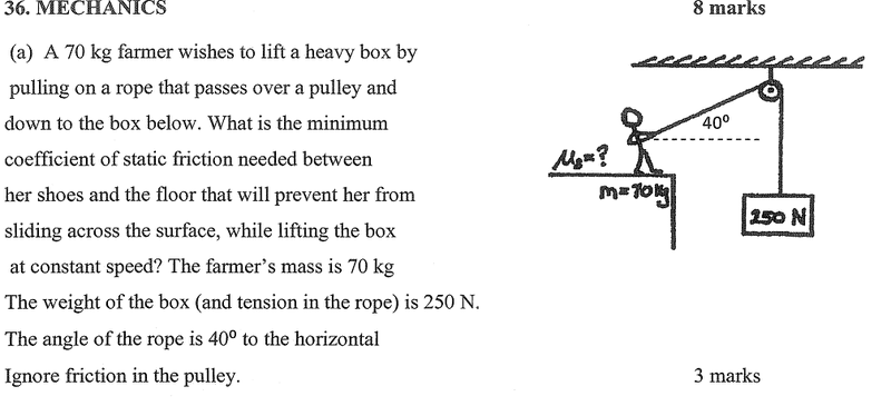 - Participants discuss the use of free body diagrams to analyze forces acting on the farmer, including tension and normal force. There are attempts to clarify how to derive the minimum static friction from the equations provided, with some questioning the definitions and relationships between the forces involved.