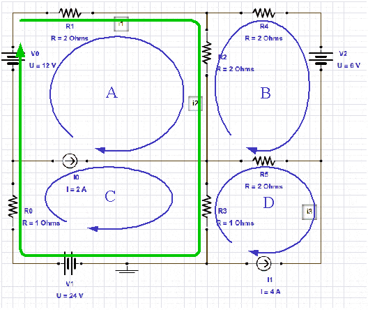 Let's call iA the current in mesh A, iB the current in mesh B, and so on.