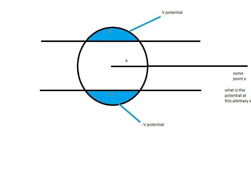 -a/2 where the center of the sphere is at the origin. The upper part V and the lower part has -V potentials, while the mid part is grounded. Find the electric potential at x up to
