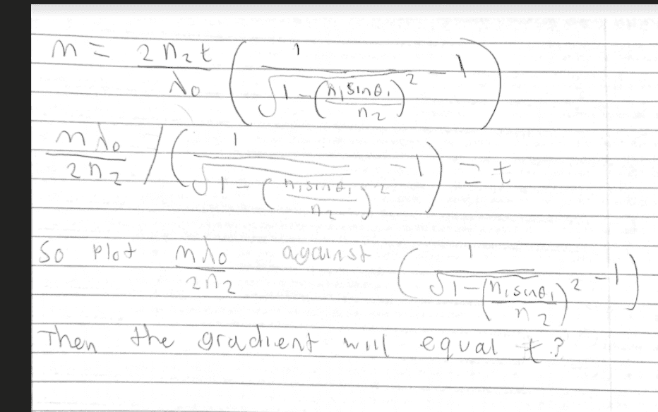 - Participants discuss plotting specific equations related to the interferometer's setup, questioning the validity of certain assumptions and the applicability of derived formulas at various angles of incidence. There is an exploration of the effects of different refractive indices and the implications of varying the angle of incidence on the measurements.