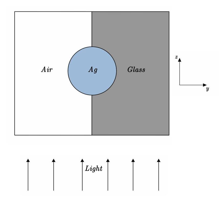 - Suppose a particle of Ag with diameter of 100nm is partially embeded in a glass substrate so that half of the particle is surrounded by glass, while the other half is surrounded by air. The refractive index of the glass substrate is 1.5. Use Mie scattering theory to analyze the scattering and absorption spectrums between 300nm and 1000nm.