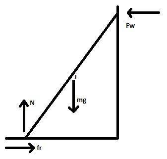 The discussion focuses on determining the minimum angle, θ, at which a uniform ladder of mass m and length l will not slip against a frictionless wall, given a static friction coefficient, μ_s. The participant outlines their approach using free body diagrams (FBD) and equations of equilibrium, including SFx and SFy. However, they receive feedback indicating that their torque equation is flawed, specifically regarding the lever arm for the wall force moment, which needs to be expressed as a function of L and θ.