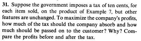 Good point(s).tnich said:It is difficult to interpret the intent of the problem's author, and I think it is commendable that you dug deeper for the background on the problem. I would point out that in your formulation of the problem, there is nothing to prevent the firm from passing on all 10 cents of the tax per item to the customer (that is, setting ##a =0##). In that case we would end up with the original optimal solution, ##x=7,500##. That makes me wonder if your interpretation is what the author really intended.
