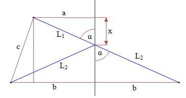 $$(l_1^2+l_2^2)'=0~~\rightarrow~~x=\frac{1}{2}\sqrt{c^2-(b-a)^2}=\frac{d}{2}$$