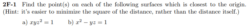 - Participants discuss minimizing a distance function defined as \(f(x,y,z)=x^2+y^2+z^2\) and question the validity of critical points derived from this function. Some suggest using polar coordinates and Lagrange multipliers as alternative methods.