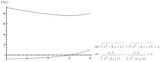 A point P needs to be located somewhere on the line AD so that the total length L of cables linking P to the points A, B, and C is minimized (see the figure). Express L as a function of x = |AP| and use the graphs of L and dL/dx to estimate the minimum value of L. (Round your answer to two decimal places. Assume that |BD| = 1 m, |CD| = 3 m, and |AD| = 4 m.)
