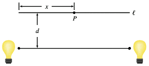 Two light sources of identical strength are placed 8 m apart. An object is to be placed at a point P on a line ℓ parallel to the line joining the light sources and at a distance d meters from it (see the figure). We want to locate P on ℓ so that the intensity of illumination is minimized. We need to use the fact that the intensity of illumination for a single source is directly proportional to the strength of the source and inversely proportional to the square of the distance from the source.