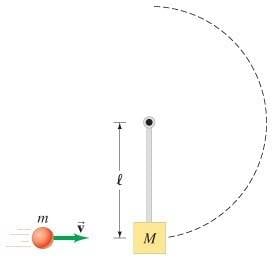 A pendulum consists of a mass M hanging at the bottom end of a massless rod of length l, which has a frictionless pivot at its top end. A mass m, moving as shown in the figure with velocity v impacts M and becomes embedded.