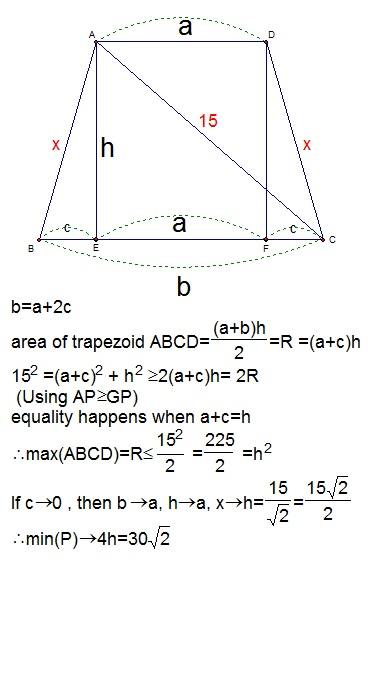 The discussion revolves around finding the maximum area (R) and minimum perimeter (P) of a trapezoid ABCD, where sides AD and BC are parallel, sides AB and CD are equal, and both diagonals AC and BD measure 15 units. The focus is on the mathematical reasoning and proofs related to these geometric properties.