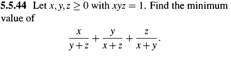 The discussion revolves around finding the minimum value of an inequality involving three variables, specifically focusing on the expression \(\frac{x}{y+z} + \frac{y}{x+z} + \frac{z}{x+y}\). Participants explore various mathematical inequalities and approaches to tackle the problem.