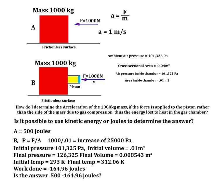 - Participants are exploring the implications of applying a force to a system with and without gas compression, questioning how energy conservation applies in each scenario. There are discussions about the dimensions of acceleration and the interpretation of kinetic energy in relation to time.