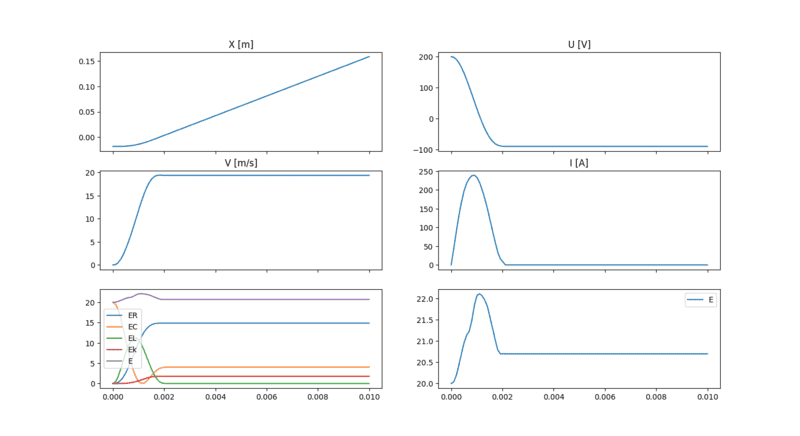 The general idea was to model movement and electrical stuff with diff equations and do the hard part with femm. The thing is that since femm can't do transient calculations, I decided to run multiple static simulation for various projectile positions and various currents and store force and inductance to interpolate them later. This way I got F(x, i) and L(x, i) that I'm later using in scipy.
