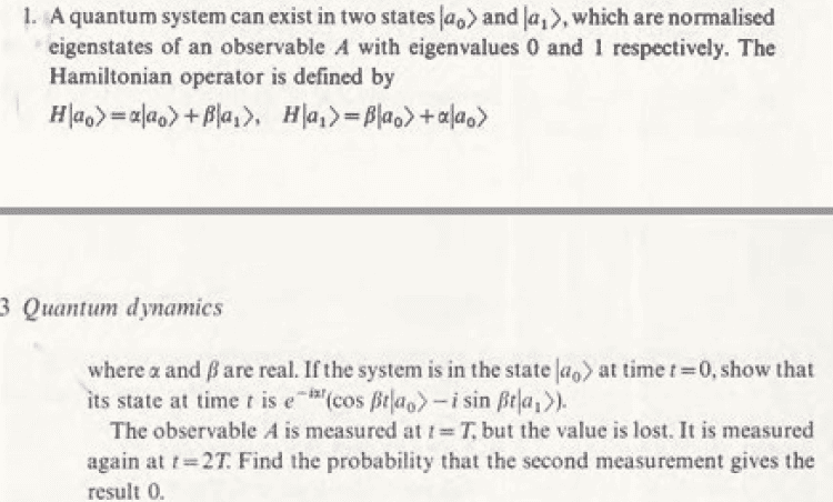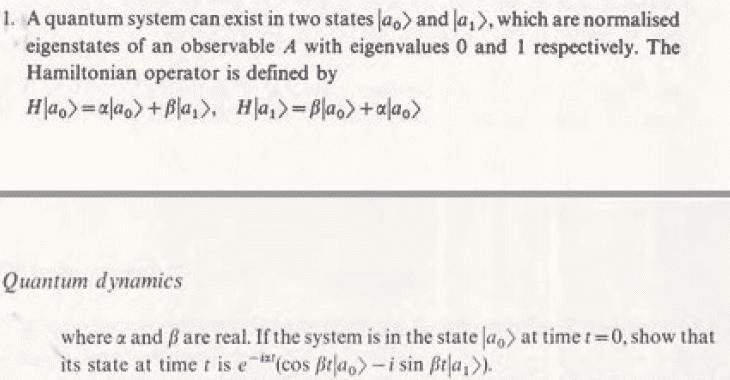 I thought that would be a good idea to work with ##\psi = \alpha |a_{0}\rangle + \beta |a_{1}\rangle## in the Schrödinger equation with time involved, so that we get a system of differential equations. $$d\alpha/dt = \alpha*a + \beta*b$$$$d\beta/dt = \alpha*r$$$$ \beta(0) = 0$$