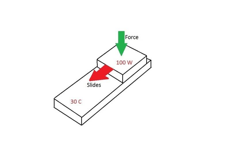 I have a little problem I'm thinking about for work. We are considering a design that moves heat across a contact interface between 2 heat exchangers, each made of copper, in a high vacuum environment. There will be one fixed heat exchanger, maintained at 25 C by coolant flow. This fixed heat exchanger is about 2" x 6" x 1/2" thick. Against this slides a 2" x 2" x 1/2" thick block, which provides a 100W heat load. The smaller block has a lengthwise stroke of about 4". Both contact surfaces can be specified with a very high surface quality, and will be lubed with vacuum grease. The force which holds the two blocks together is up to me. The system needs to be reliable for about 100k cycles or 10 years.