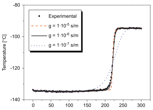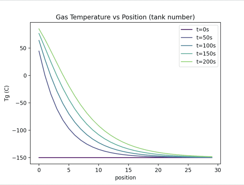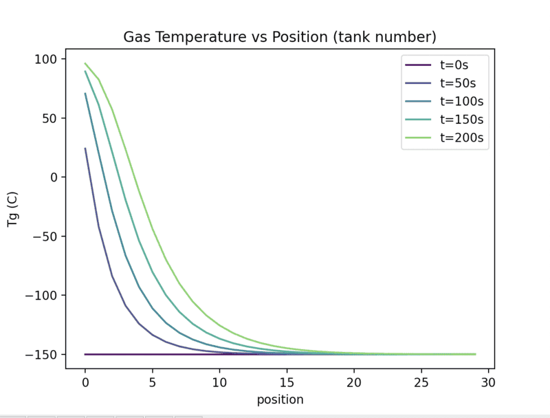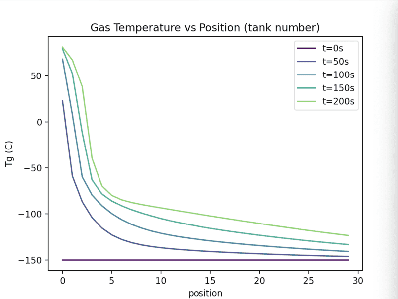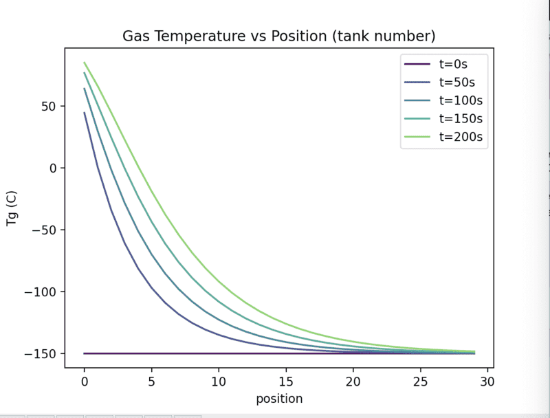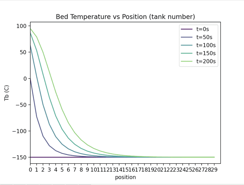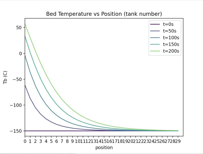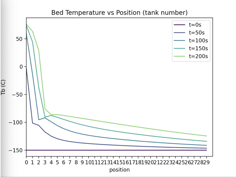 The x-axis is time in seconds and the temperature is the outlet temperature of the packed bed. Does this not say that their temperature reaches a maximum at roughly -90C also? But surely this is at odds with Fig 6 and 5 which show the temperature going above this. Or have I misunderstood? Because fig 7 looks a lot like our time vs Tg plot (besides the time scale)