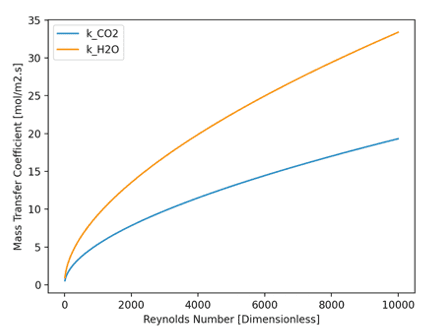 Reynolds Number vs Mass Transfer Coefficient for CO2 and H2O: