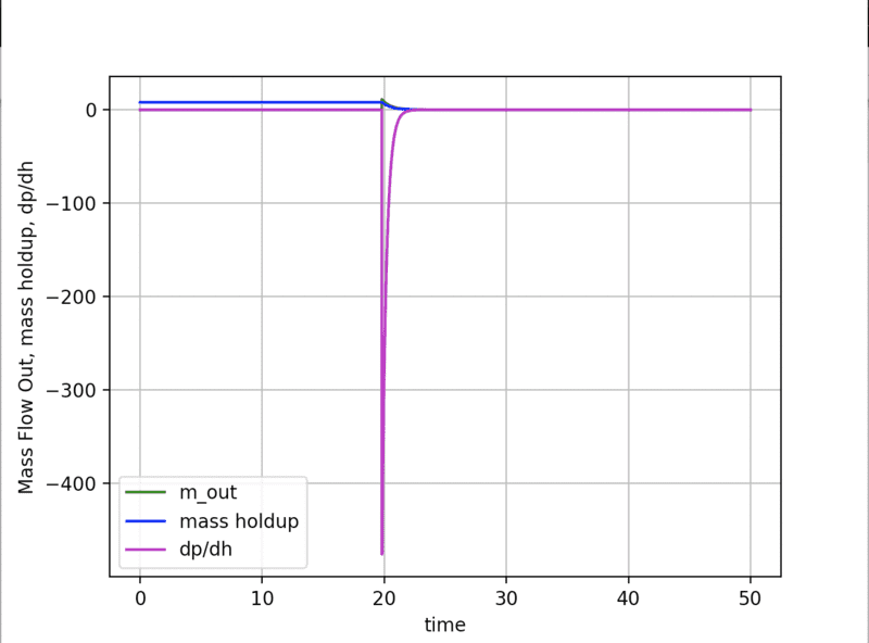 2) The purple line shows dp/dh = 0 in the liquid phase. As we move through the saturation zone dp/dh is negative, which I think is expected as density will decrease as enthalpy increases. Then it levels out after saturation as the change in density returns back to close to zero (not actually zero it reaches a minimum value of about -0.012 in this time range)