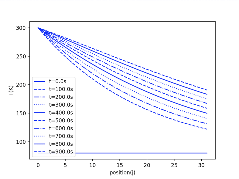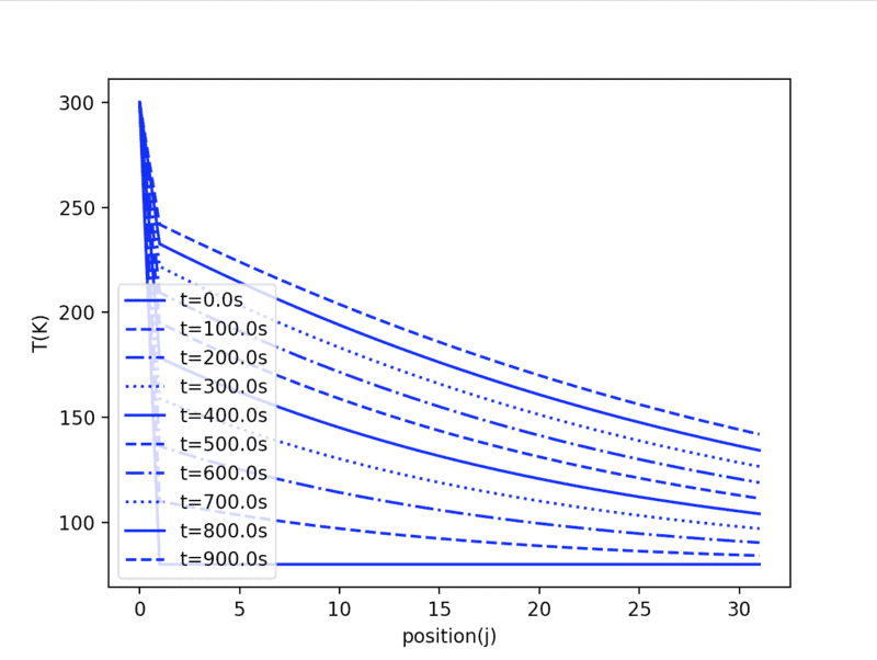 The notation on the graph above is poor. 'Position 1' is at index 0. Position 1 is where the boundary conditions are applied. The way the code is set up, the bed/fluid temperatures for the entire bed are both set to 80K, and then the first position only is overwritten, and this is the boundary condition: