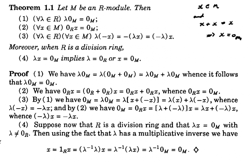 (4) ##\lambda x = 0_M## implies ##\lambda = 0_R## or ##x = 0_M## ... ... "Blyth proves that if ##R## is a division ring and ##\lambda x = 0_M## with ##\lambda \neq 0_R## then we have that ##x = 0_M## ... ...But ... ... Blyth does not show that if ##R## is a division ring and ##\lambda x = 0_M## with ##x \neq 0_M## then we have that ##\lambda = 0_R## ... ...Can someone please help me to prove this ...