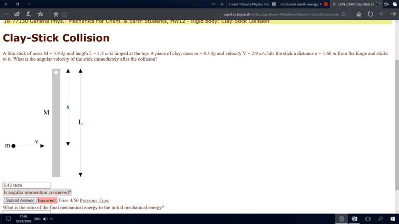 A thin stick of mass M = 3.9 kg and length L = 1.8 m is hinged at the top. A piece of clay, mass m = 0.3 kg and velocity V = 2.9 m/s hits the stick a distance x = 1.60 m from the hinge and sticks to it. What is the angular velocity of the stick immediately after the collision?
