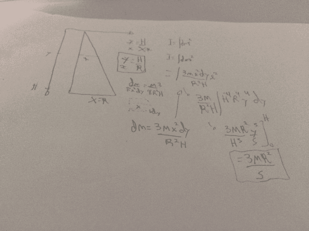 - Participants explore the general equation for moment of inertia and its application to a cone, questioning the division by two in the context of disk elements. Some participants attempt to relate the moment of inertia of a disk to the cone's calculation.