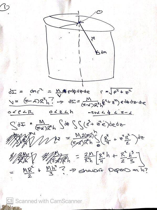 I=∫∫∫ dm r^2 -> Cylindrical Coords: (r from 0 to R) (z from zero to h) (theta from -Pi + a to Pi-a)