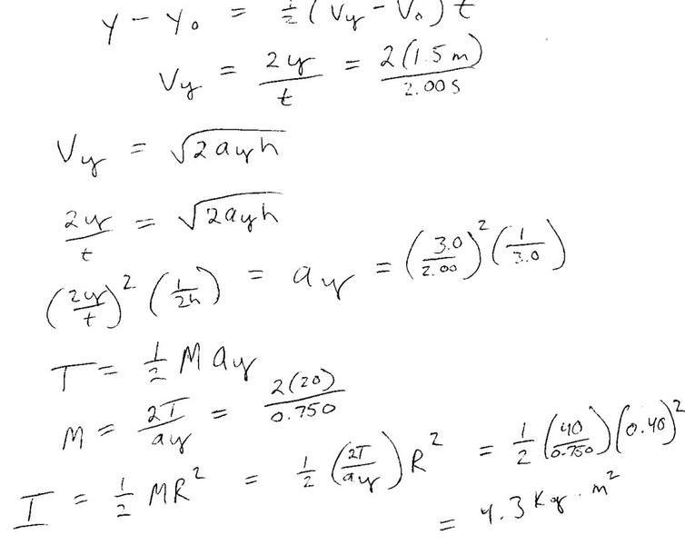 I think I have solved the problem correctly and through my method I determine the moment of inertia to be 4.3 kg*m^2. However I'm not sure if the equations I used to find velocity and acceleration are valid in this situation.