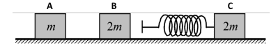 - Objects A, B, and C with masses m, 2m, and 2m respectively, slide on a horizontal frictionless surface and object C is connected with a massless spring with spring constant k. Object A travels at a velocity v to the right and objects B and C are stationary initially. During the collisions between A, B, and C, show that the maximum change in the length of the spring is sqrt (4mv^2/9k). Note that the collision between A and B is elastic.
